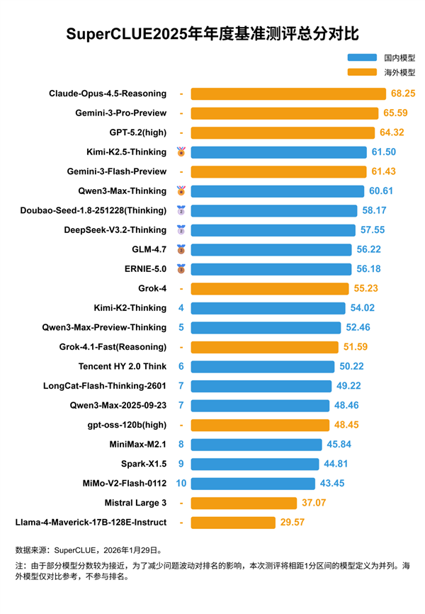 值得关注的是,国产大模型正加速由“跟跑”转向“并跑”。在开源类别中,Kimi-K2.5-Thinking以61.50分成为国内最佳,位居全球第四;闭源阵营方面,Qwen3-Max-Thinking以60.61分排名第六,展现出强劲追赶势头。