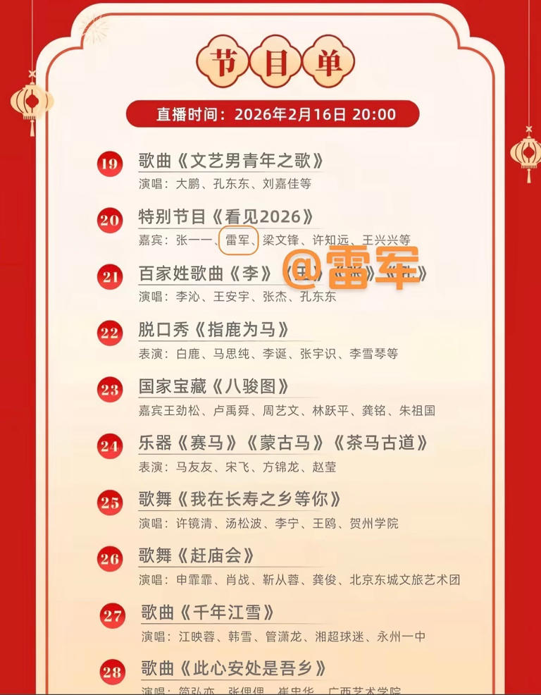 【区角快讯】2026年2月6日,距离丙午马年春节临近,一则关于科技界代表人物或将登上央视春晚舞台的消息引发广泛关注。据网络流传的一份春晚节目单显示,小米集团创始人、董事长兼首席执行官雷军,人工智能企业DeepSeek创始人梁文锋,以及人形机器人公司宇树科技的创始人、首席执行官兼首席技术官王兴兴,均被列入出席名单。