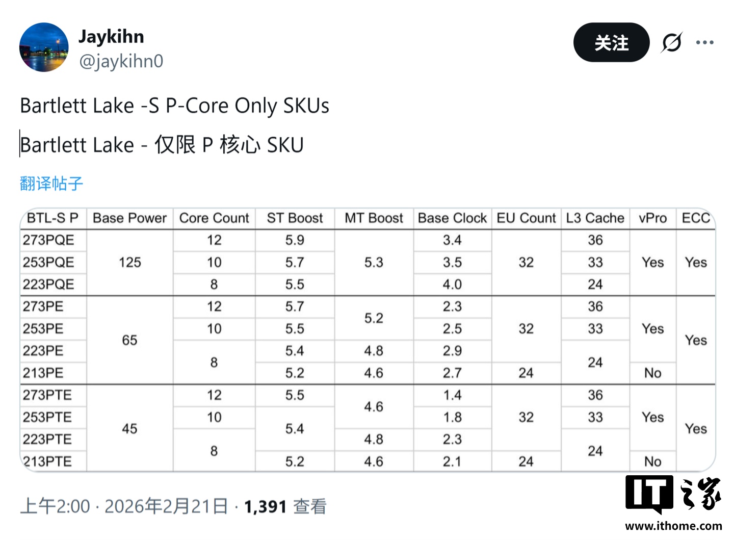 【区角快讯】据2月21日披露的信息,英特尔Bartlett Lake-S平台旗下的酷睿200E系列处理器核心规格已由海外媒体公开。该系列最高搭载12个性能核(P-Core),单核睿频可达5.9GHz,并兼容当前主流的LGA-1700插槽。
