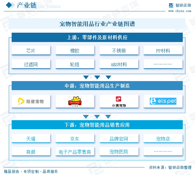 宠物智能用品行业产业链上游为零部件及原材料供应环节,主要包括芯片、橡胶、不锈钢、PP材料、过滤网、轮组、ABS材料等。产业链中游为宠物智能用品生产制造环节,代表企业有小佩宠物、陪彼宠物、小米、美的等。产业链下游为宠物智能用品销售应用环节,即通过天猫、京东、品牌官网、宠物店、商超、电子产品零售商、宠物医院等线上线下销售渠道将产品传递至终端宠物主消费者。