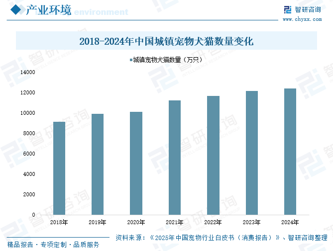 进入 21 世纪以来,随着我国城市化进程加快,社会老龄化、独居人群大大增加,宠物因缓解压力、陪伴、社交等属性受到青睐,养宠成为大众的主流生活习惯,养宠人群及宠物数量的规模均在不断扩大。数据显示,2024年,我国城镇宠物犬猫数量已从202018年的9149万只上升至12411万只,同比增长2.1%;其中,宠物犬数量为5258万只,较2023年增长1.6%,宠物猫数量为7153万只,较2023年增长2.5%。