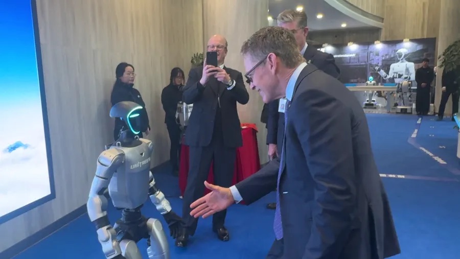 互动环节中,德国高管们纷纷与机器人合影留念,并半开玩笑地提醒彼此:“小心点,这玩意儿可不便宜!”言语间既流露对前沿技术的浓厚兴趣,也透露出对成本与价值的现实考量。