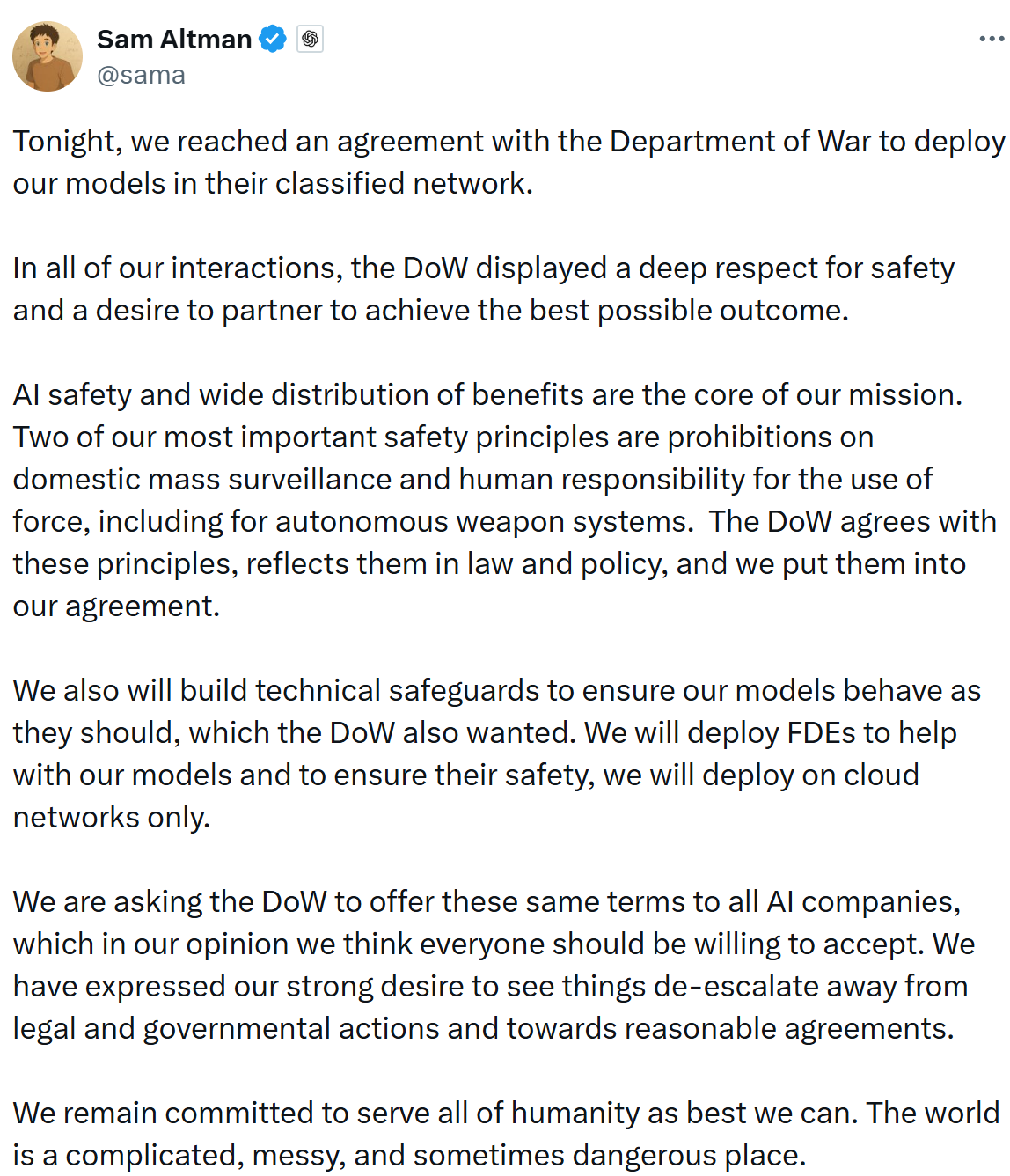 他在帖文中表示,OpenAI最重要的两项安全原则是“禁止国内大规模监控”以及“武力使用必须由人类负责,包括自主武器系统”。奥特曼称,公司已将这些原则写入与该部门的协议中,他使用了美国政府偏好的“战争部(DoW)”这一称谓,且国防部已同意遵守这些原则。