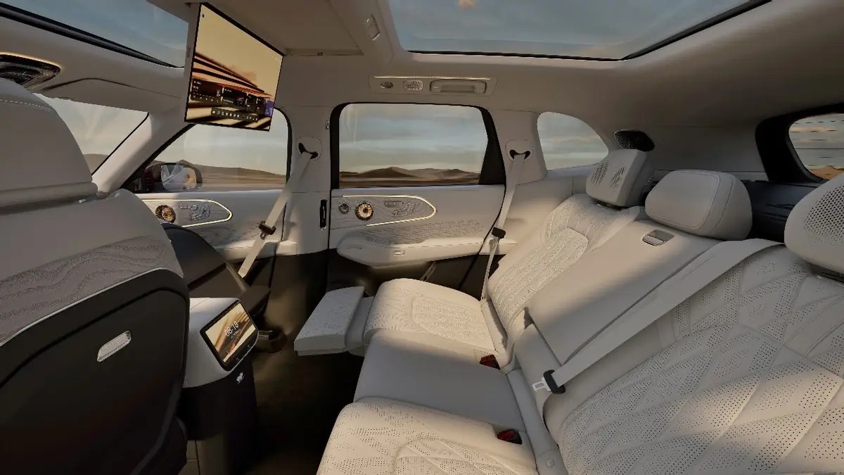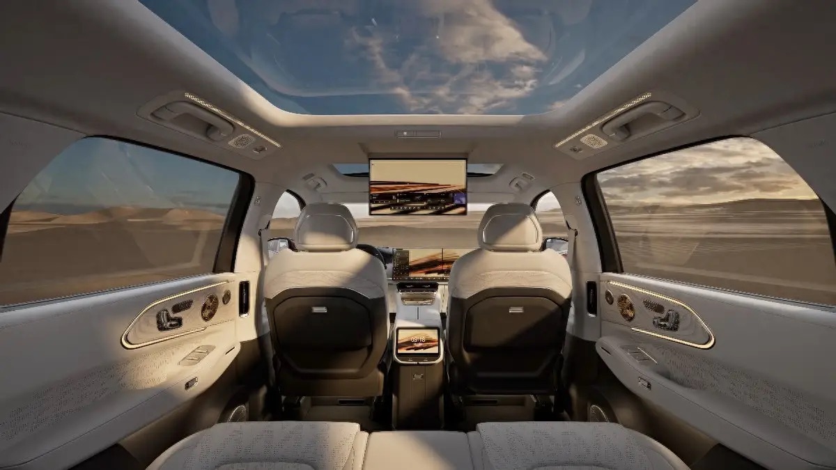 第二排座椅配置尤为突出,配备17英寸3K分辨率OLED吸顶娱乐屏与全景大天幕。座椅支持通风、加热及按摩功能,靠背最大可调至137°,前后滑动行程达150mm,腿托调节角度高达90°,控制按键集成于门板内侧,全面提升乘坐体验。