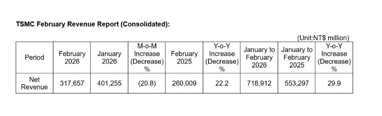 台积电2026年前两月营收强劲增长,2月单月同比增幅达22.2%