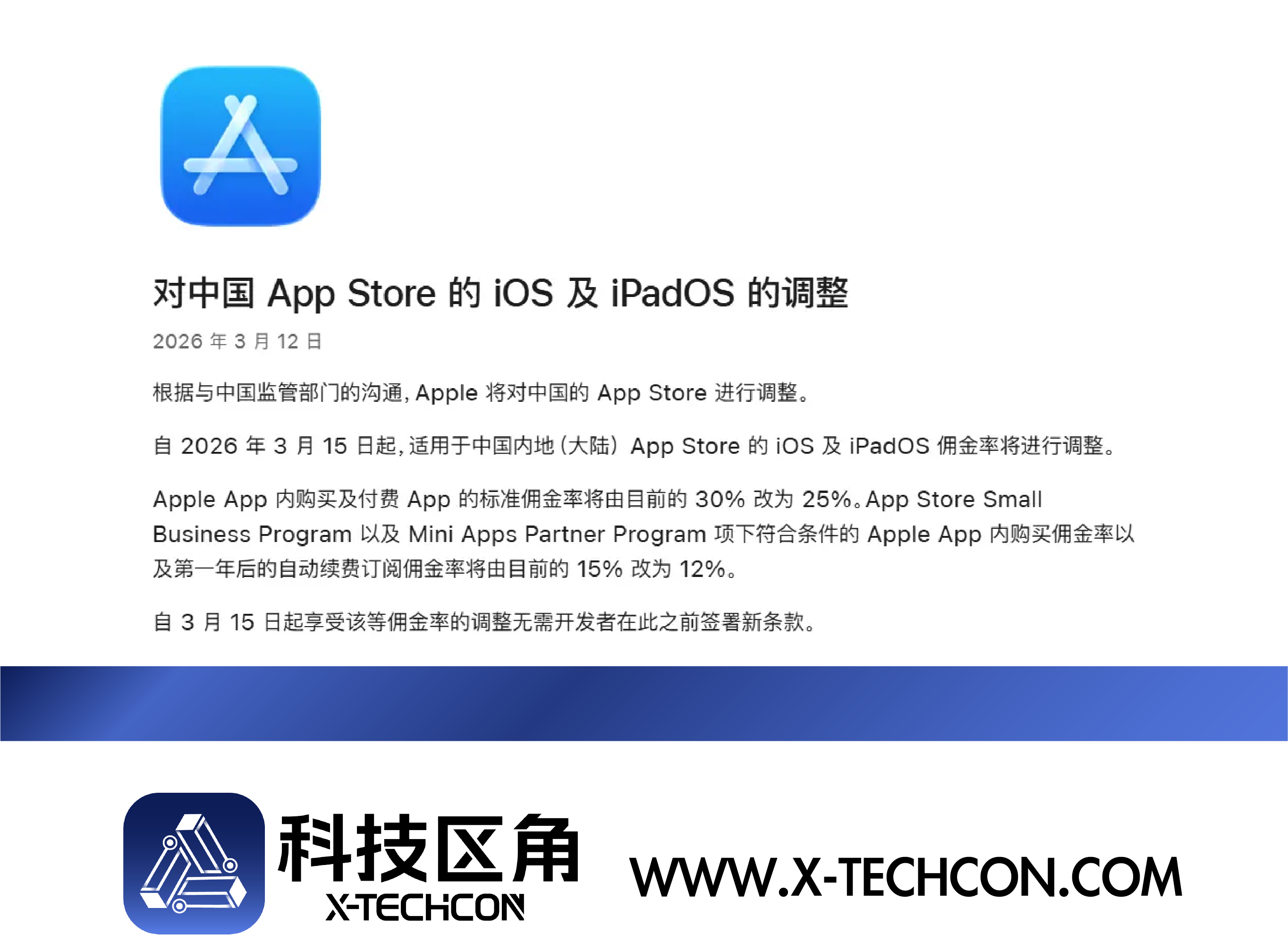 【区角快讯】2026年3月13日,苹果公司正式宣布对中国内地App Store的佣金结构进行调整。根据新政策,自3月15日起,标准App内购买及付费应用的佣金比例将从30%降至25%;同时,适用于App Store小型企业计划、小程序合作伙伴计划以及首年后的自动续费订阅,其佣金率也将由15%下调至12%。