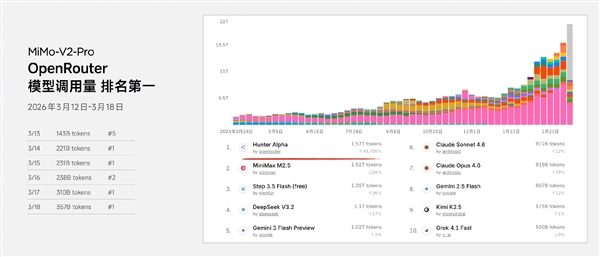小米集团创始人、CEO雷军当日透露,MiMo-V2-Pro已于上周以匿名形式上线全球最大的大模型API聚合平台OpenRouter,并迅速攀升至日榜首位,目前已稳居周榜第一。他指出,OpenRouter作为开发者广泛使用的模型调用平台,其榜单排名直接反映模型在能力、推理速度与运行成本等方面的综合竞争力,调用量越高,通常代表开发者认可度越强。