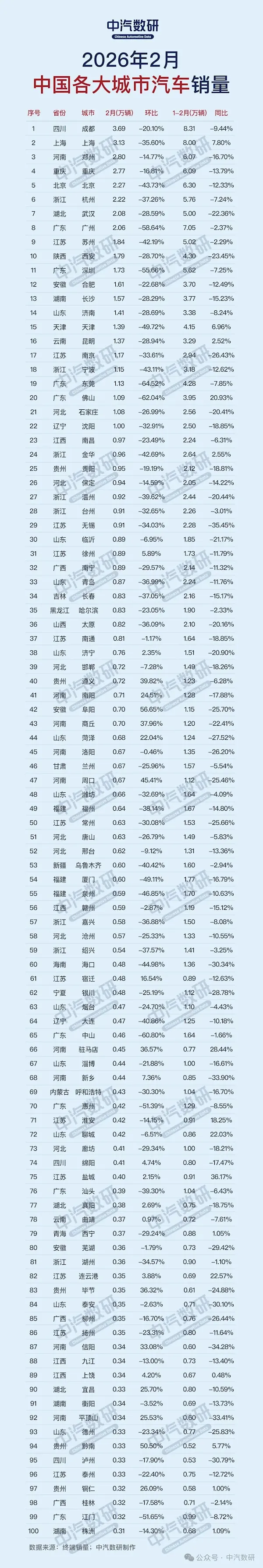 【区角快讯】中汽数研于4月4日公布了2026年2月全国百城汽车终端销量排名。受春节假期缩短、有效工作日减少及节前购车需求提前释放等多重因素影响,当月车市整体呈现季节性回落态势。