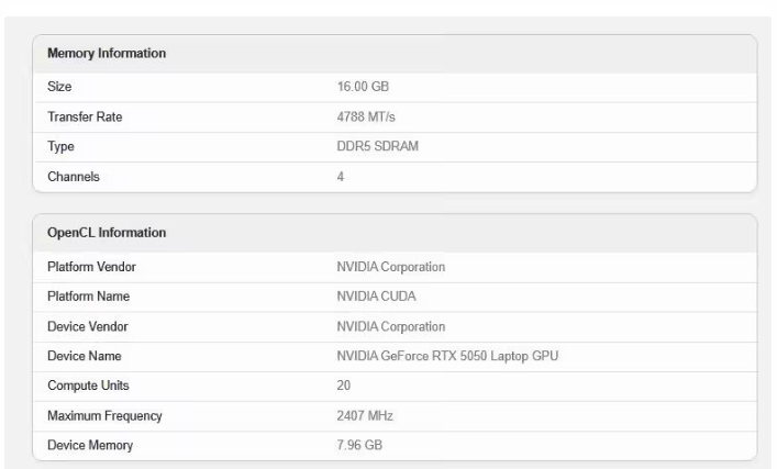 新 闻 2: 英伟达 RTX 5050 笔记本显卡跑分曝光:8GB 显存,OpenCL 跑分较 RTX 4050 高 11%