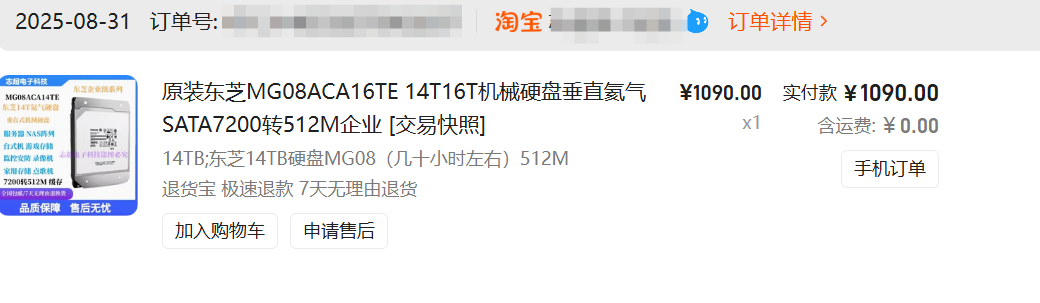 然而这还不算完,8月底的时候,我一个硬盘出现了问题,再去买的时候,好家伙,14T要1100块!这距离我写完8月下,不到10天的时间,就涨了150块钱,但是硬盘坏了,只能忍痛买下。当然这还不是终点,根据网上大V的消息,据说还会继续再涨。