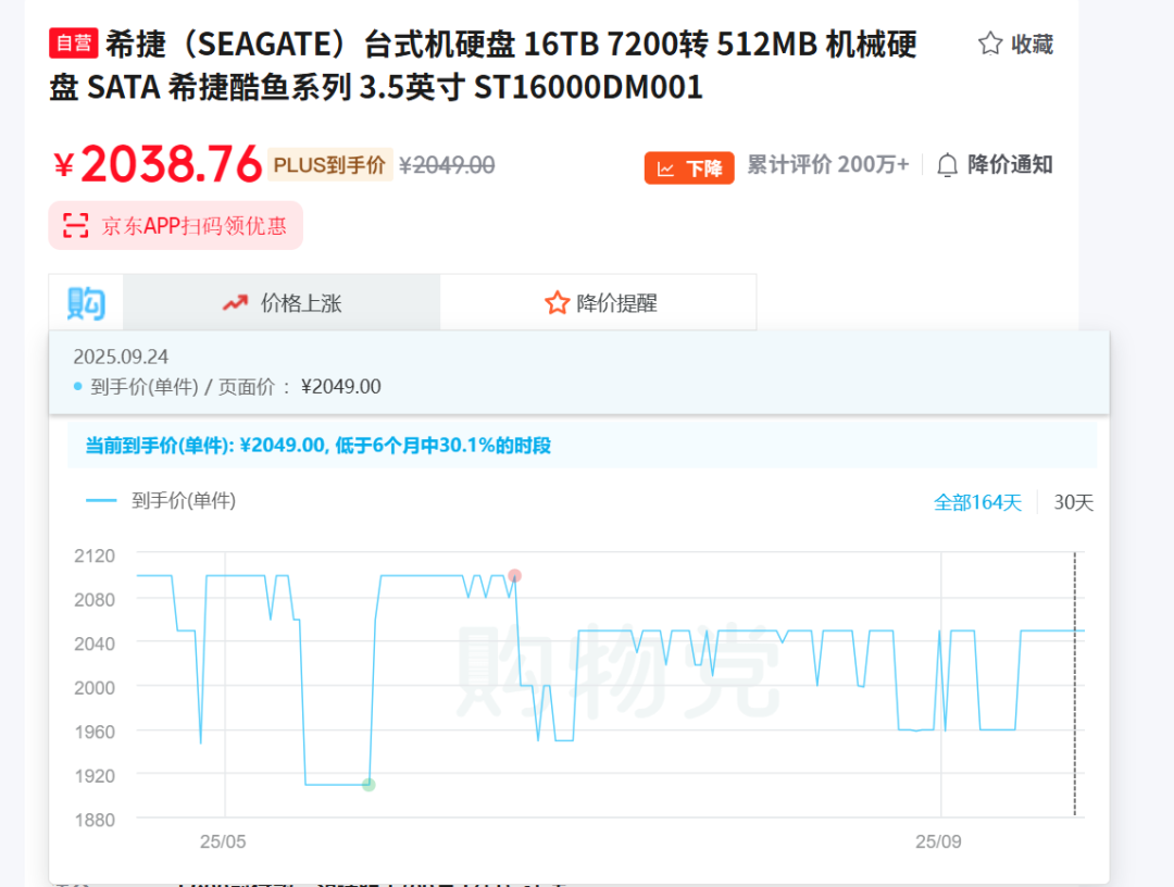 那么可能性较大的原因是什么呢?我觉得比较大的原因有二。一个是因为大船靠岸数量少了,因为全新盘虽然有涨价,但是没有二手盘这么离谱,以京东希捷全新16T为例,可以看大硬盘的价格波动不到200元。