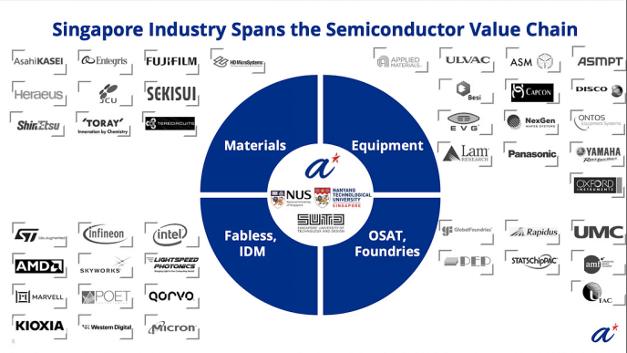 随着半导体产业进入以先进封装和异构集成为标志的新时代,从材料、设计到制造和测试的每个阶段都需要深入的技术协同。虽然新加坡可能不是全球最大的晶圆生产地之一,但它凭借其国际视野、研发实力和政策稳定性,迅速建立了一个完整且协作的半导体价值链。该生态体系涵盖: