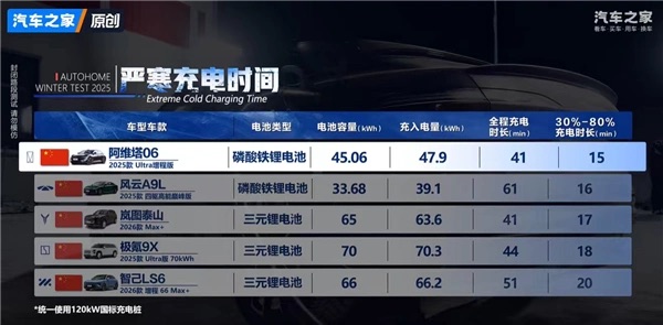 在用户高度关注的低温充电表现方面,阿维塔06 Ultra增程版同样领先。在使用120kW直流快充桩的条件下,其电池电量从30%充至80%仅耗时15分钟。这一成绩不仅在增程式电动车中遥遥领先,甚至优于多款主流纯电车型,充分体现了其电池热管理系统与充电策略在极寒环境下的高效协同能力。