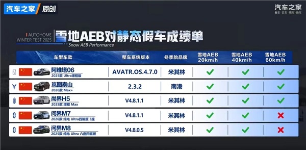 在众多参测车型中,阿维塔06 Ultra增程版表现尤为突出,在“雪地AEB紧急刹停”与“低温充电效率”两个关键项目中均位列榜首。雪地AEB测试对车辆在低附着力路面上的主动安全系统提出了极高要求。由于冰雪路面摩擦系数显著降低,常规制动距离大幅延长,因此车辆能否在高速状态下及时识别障碍并有效刹停,成为衡量智能驾驶辅助系统可靠性的核心指标。测试结果显示,阿维塔06 Ultra增程版在雪地AEB测试中成功实现60km/h时速下的完全刹停,与岚图泰山、尚界H5并列最高成绩。值得注意的是,后两款车型均搭载华为乾崑ADS高阶智驾方案,而阿维塔06 Ultra则凭借其ESP车身稳定控制系统与AEB算法的深度协同,以及标配的米其林高性能冬季轮胎,在极端条件下展现出优异的制动稳定性。