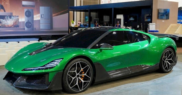 该车采用鲜明的绿色车身涂装,整体造型极具攻击性,前脸线条低趴且锋利,并装配了夸张的空气动力学组件,视觉风格与法拉利F8存在相似之处。前大灯由四段长度不一的LED灯条构成独特的“L形”布局,辨识度较高。轮毂为六辐式设计,搭配亮黄色高性能刹车卡钳。车尾部分则配备大型固定扰流尾翼,贯穿式尾灯采用蜂窝状光珠矩阵,与尾部曲面自然融合。