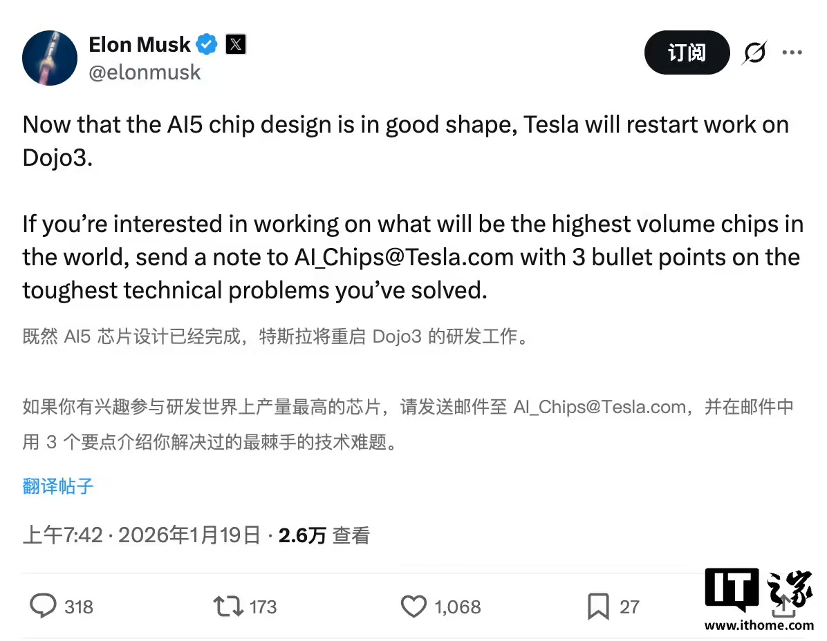【科技纵览】2026年1月19日早间,特斯拉首席执行官埃隆·马斯克通过社交平台X正式宣布,伴随AI5芯片设计工作的完成,公司将重新启动此前被搁置的超级计算机项目Dojo 3。这一决定标志着特斯拉在人工智能硬件布局上的重大调整。